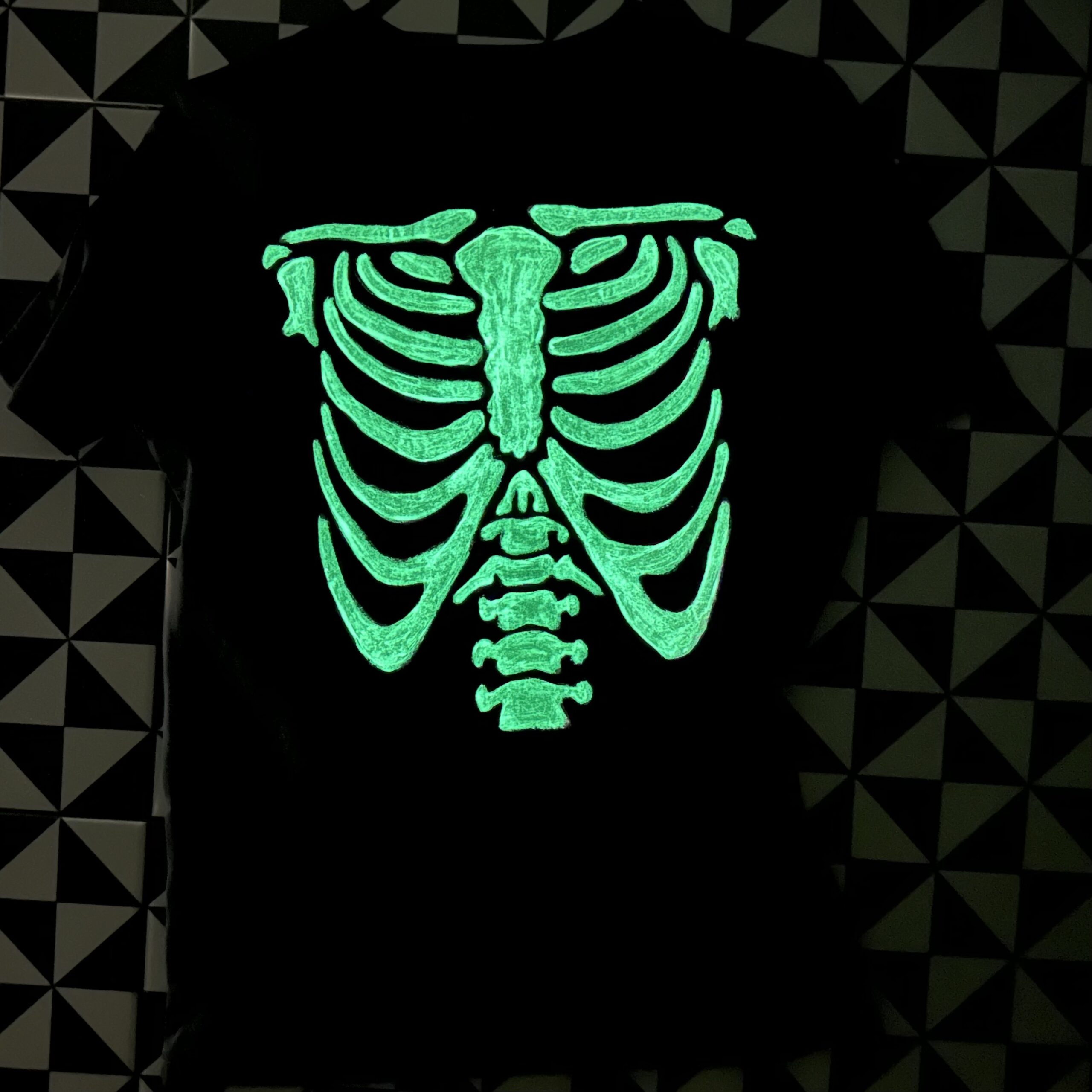 – koszulka ze strrraaaasznie świecącym szkieletem, to świetna opcja na Halloween dla całej rodziny!