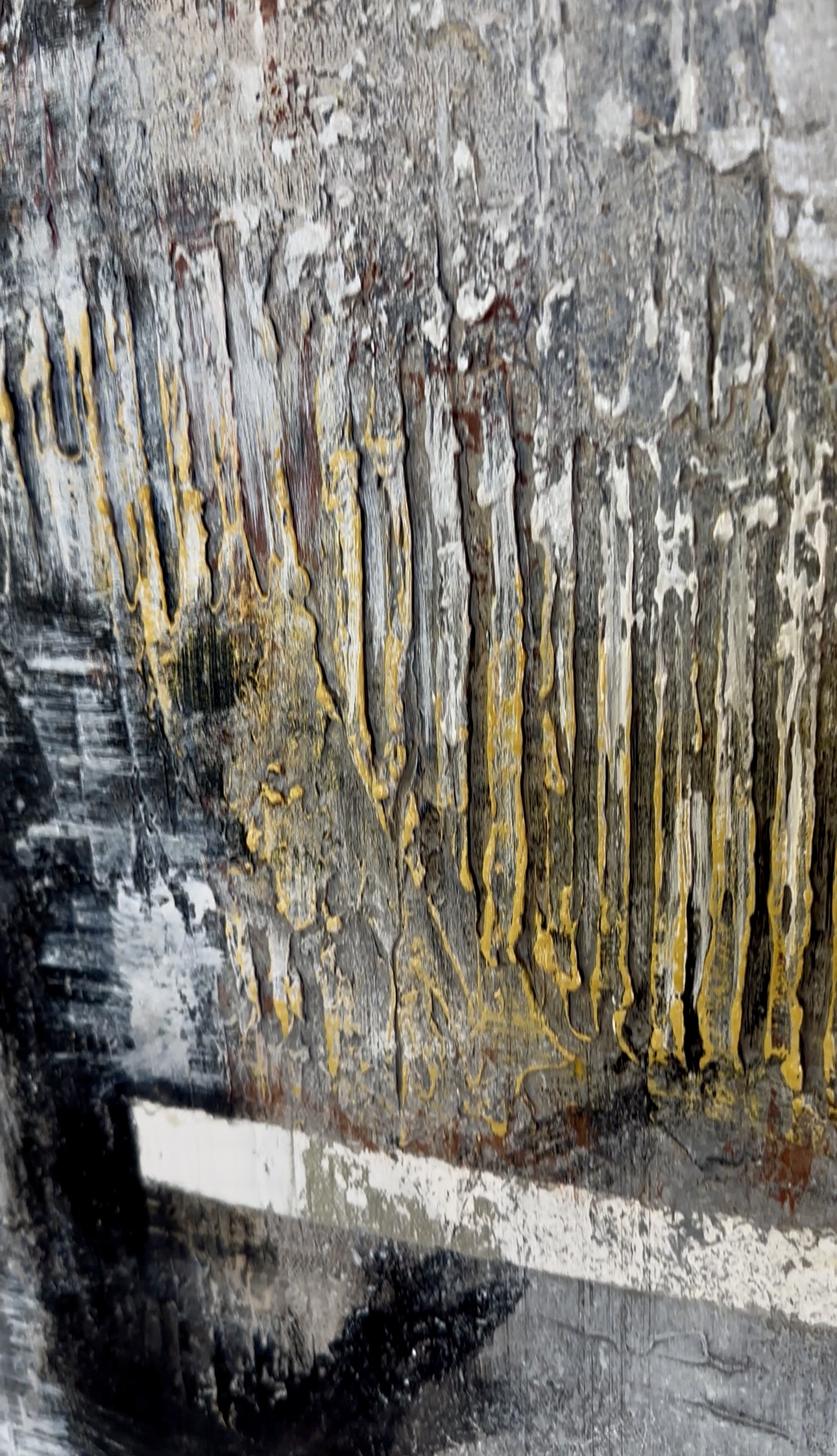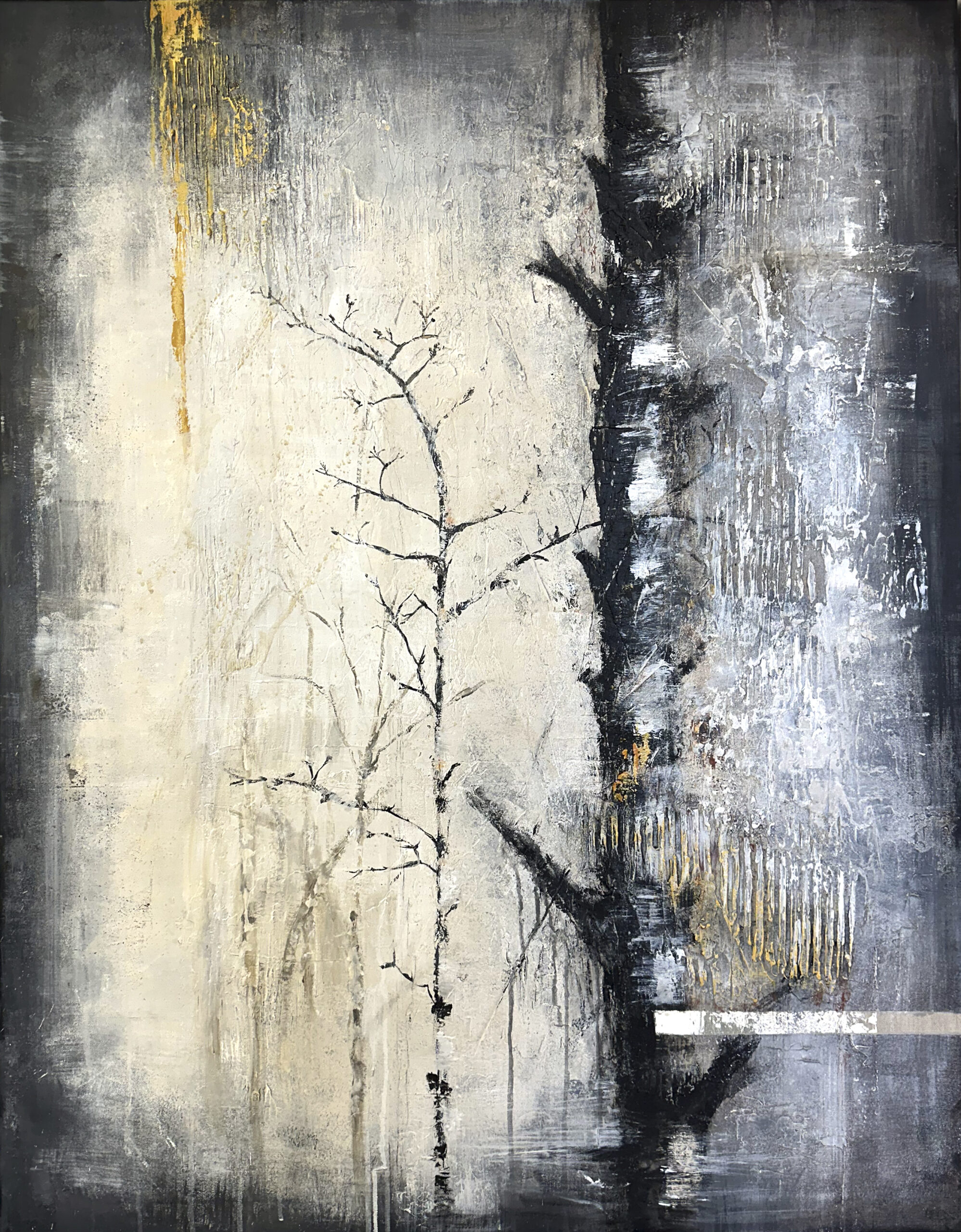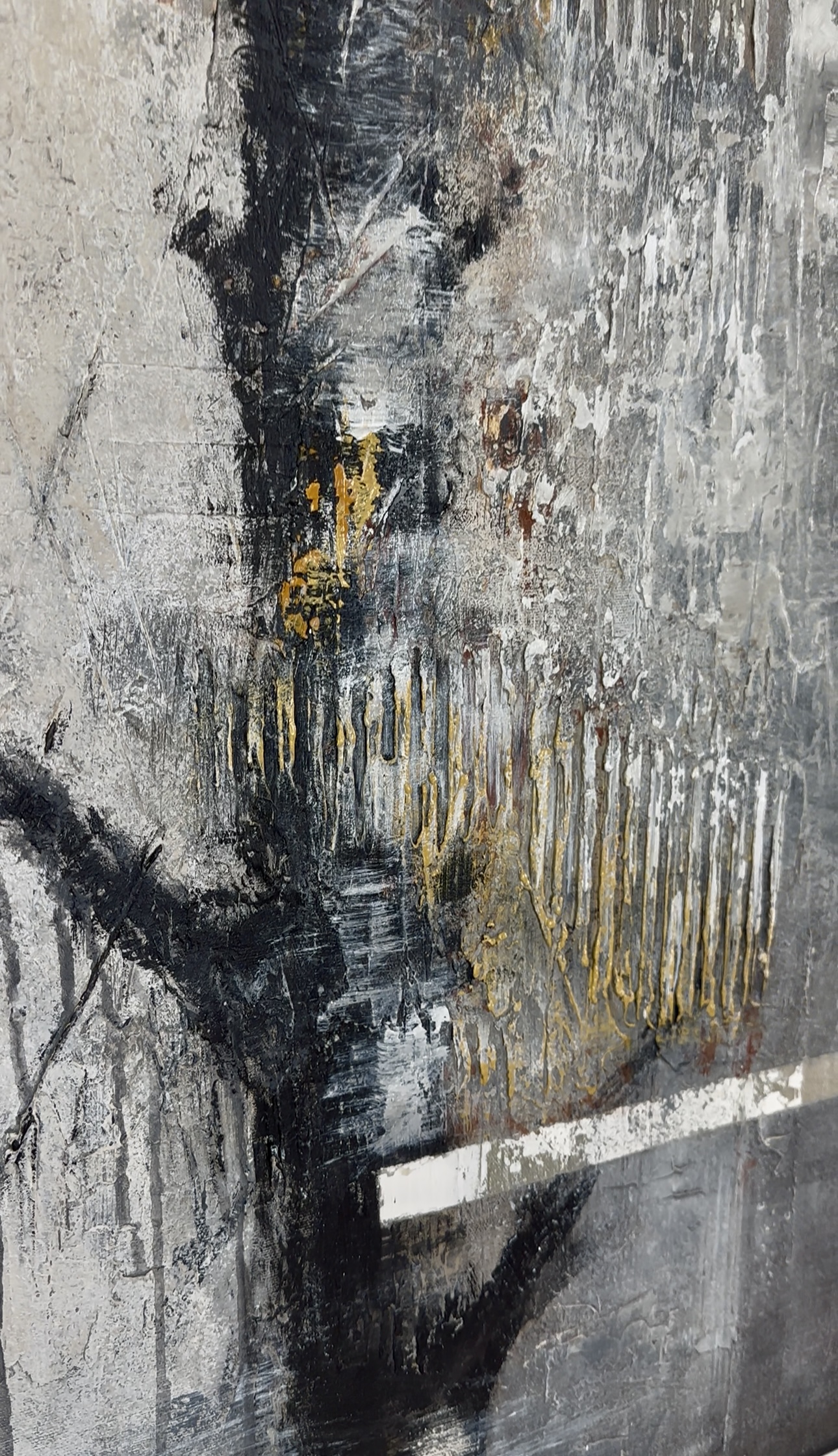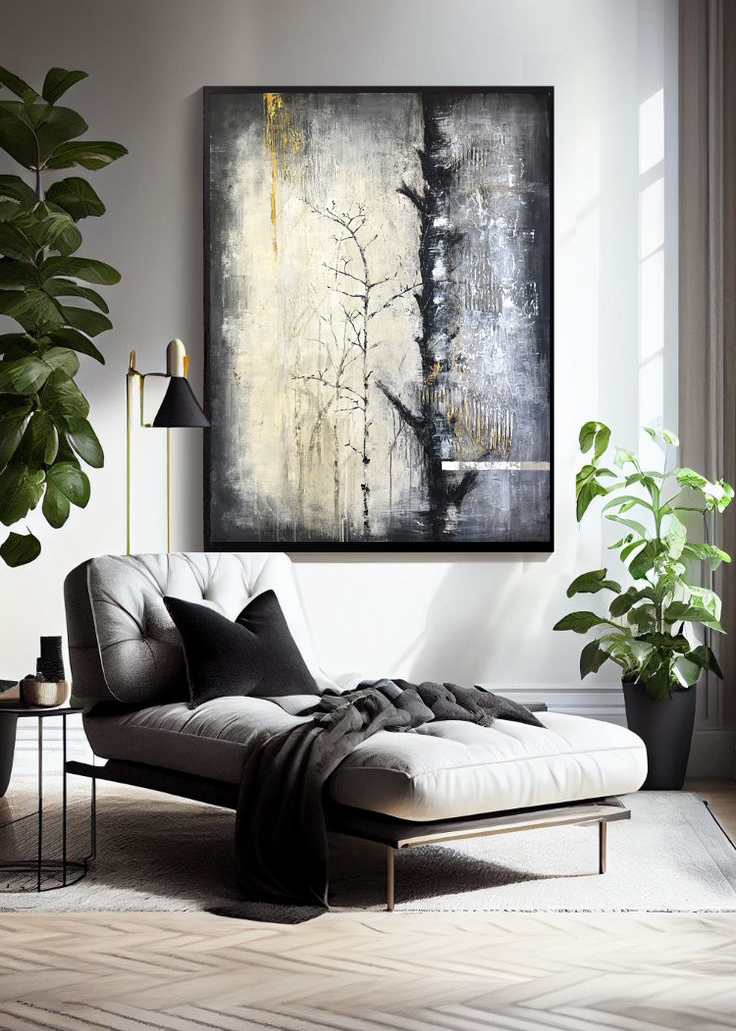 Strukturalna powierzchnia, naturalna paleta szarości, beżu, czerni i subtelnych akcentów żółci sprawiają, że obraz zmienia się w zależności od pory dnia i kąta padania światła. Faktura jest wyczuwalna, organiczna, inspirowana naturą i surowymi materiałami architektonicznymi.